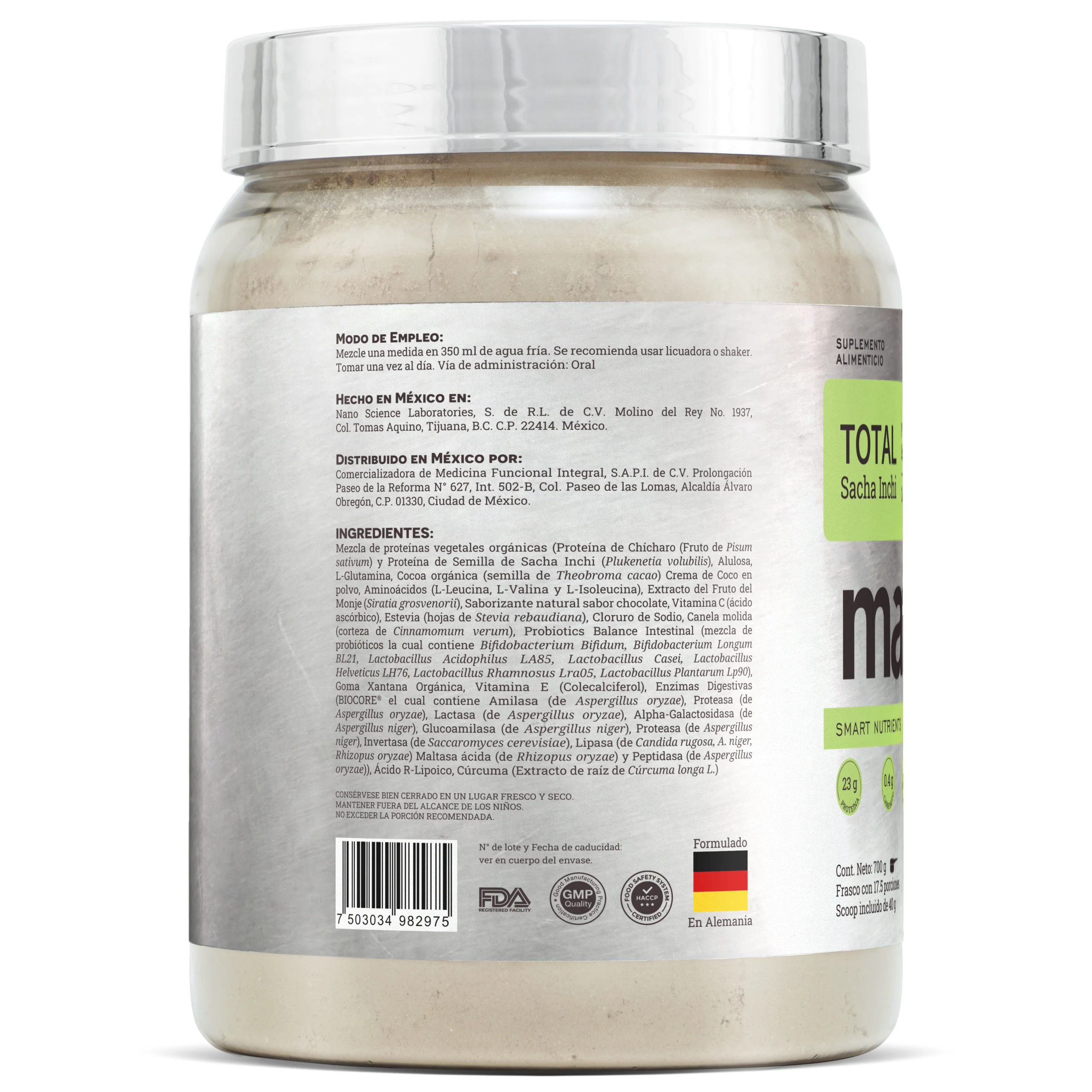 Total es una mezcla de batido rica en nutrientes ideal para veganos, personas sensibles o alérgicas a la soya y/o los lácteos, o aquellos que buscan una fuente alternativa de proteína de calidad con fácil absorción, sin malestares digestivos y otros beneficios añadidos.
